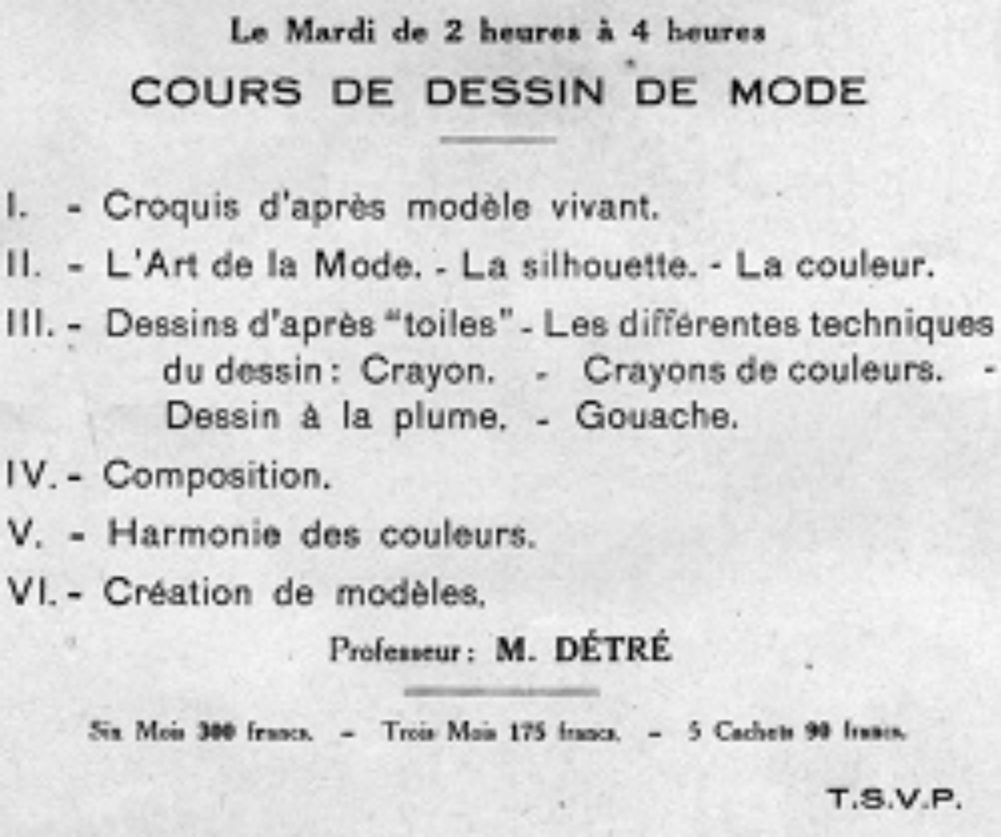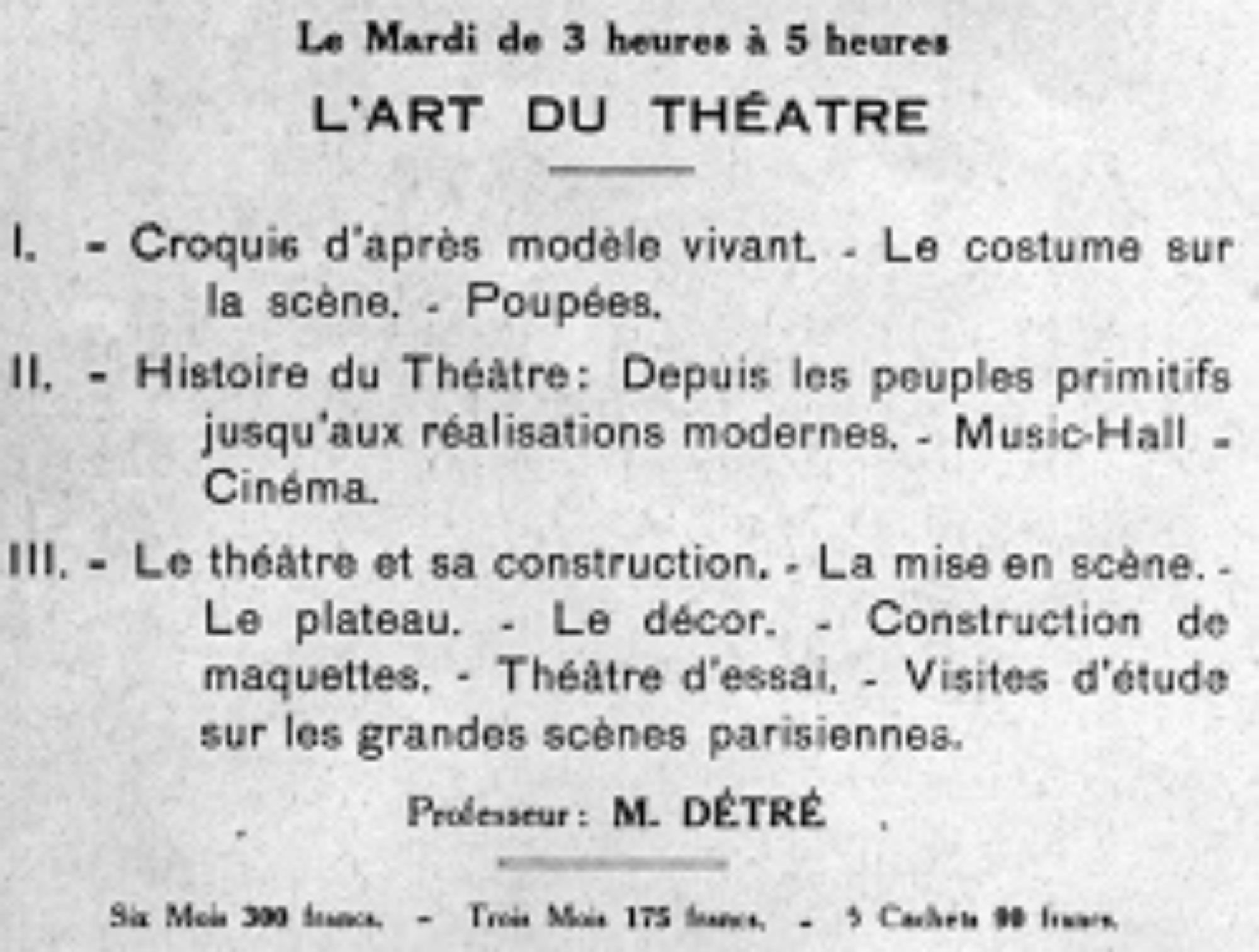 Durant plusieurs années, il donna à l’Académie Julian, à Paris, 55 rue du Cherche-Midi (Montparnasse ), des cours de Dessin de Mode et des cours d’Art du Théâtre.